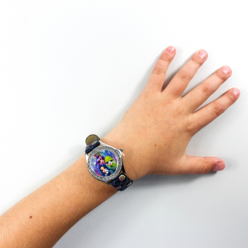 Jej trzy ulubione figurki Rainbow High są przedstawione na zegarku.