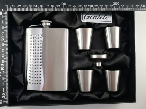 Oferta dotyczy zestawu 4 kieliszków, lejka i piersiówki. Wszystko w eleganckim pudełku z ładną wyściółką. Idealnie nadaje się na prezent. Zestaw jest praktyczny i sprawi dużo radości. Piersiówka ma pojemność 240 ml.