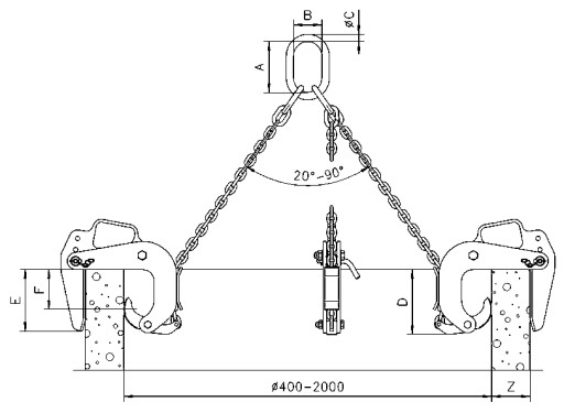 - Model uchwytu dla kręgów betonowych zgodnych z DIN 4034 do średnicy kręgu 2 000 mm , dla większych średnic uchwyty dostępne na zamówienie .