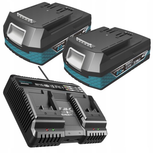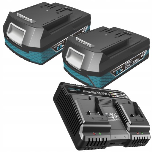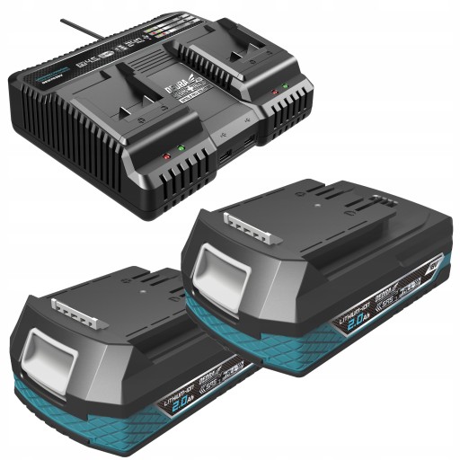 Baterię 2.0Ah naładujemy w ciągu 1h, natomiast baterię 4.0Ah w 2h. Dzięki dwóm gniazdom ładowania możesz ładować swoje akumulatory jeszcze efektywniej. Ładowarka wyposażona trzy diody: jedna informująca o podłączeniu do sieci, druga o przebiegającym procesie ładowania, trzecia informująca o zakończonym procesie ładowania baterii. Dzięki dwóm gniazdom USB możesz doładować smartfona lub głośnik bluetooth.