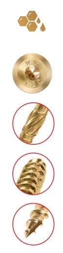 Wkręt konstrukcyjny z łbem podkładkowym i gniazdem TX do połączeń konstrukcyjnych elementów drewnianych m.in. litych, klejonych i płyt drewnopochodnych.