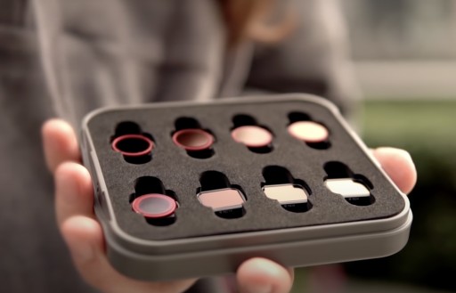 W zestawie filtry ND8, ND16, ND32 i ND64, które montuje się zamiennie z tyłu obiektywu.