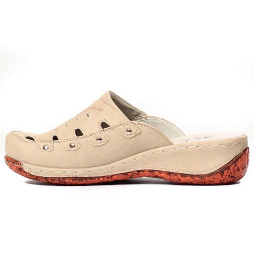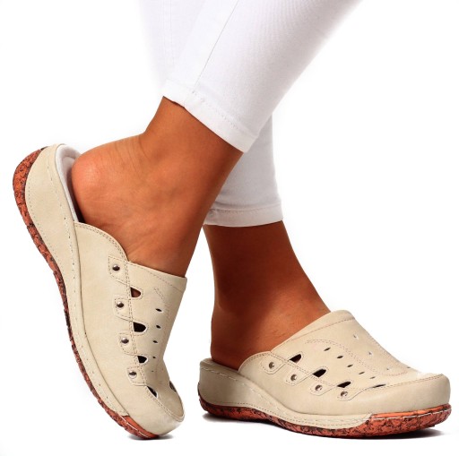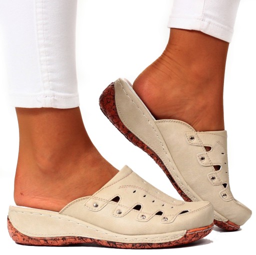 Damskie klapki w kolorze beżowym na niskiej koturnie. ❤ Wykonane z dobrych jakościowo materiałów. Idealnie sprawdzą się jako obuwie codzienne. Klapki są lekkie i zapewniają wygodę oraz komfort użytkowania. Profilowana, skórzana wkładka z poduszką amortyzującą na pięcie. Podeszwa stabilna, dobrze amortyzuje stopę. Modny, klasyczny fason idealnie dopasuje się do wielu stylizacji! Dobrze prezentuje się na nodze.💯
