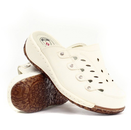 Damskie klapki w kolorze białym na niskiej koturnie. ❤ Wykonane z dobrych jakościowo materiałów. Idealnie sprawdzą się jako obuwie codzienne. Klapki są lekkie i zapewniają wygodę oraz komfort użytkowania. Profilowana, skórzana wkładka z poduszką amortyzującą na pięcie. Podeszwa stabilna, dobrze amortyzuje stopę. Modny, klasyczny fason idealnie dopasuje się do wielu stylizacji! Dobrze prezentuje się na nodze.