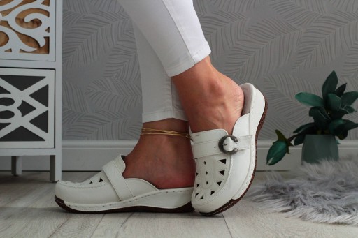 Damskie klapki w kolorze białym na niskiej koturnie z ozdobną klamerką. ❤ Wykonane z dobrych jakościowo materiałów. Idealnie sprawdzą się jako obuwie codzienne. Klapki są lekkie i zapewniają wygodę oraz komfort użytkowania. Profilowana, skórzana wkładka z poduszką amortyzującą na pięcie. Podeszwa stabilna, dobrze amortyzuje stopę. Modny, klasyczny fason idealnie dopasuje się do wielu stylizacji! Dobrze prezentuje się na nodze.