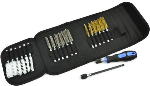 Zestaw szczotek do czyszczenia gniazd wtryskiwaczy oraz gniazd świec żarowych i iskrowych. W skład zestawu wchodzi komplet 18 szczotek o różnej twardości i średnicy oraz uchwyt wraz z przedłużką. Wszystkie szczotki z napędem 1/4” dzięki czemu z powodzeniem mogą być używane z wkrętarkami i wiertarkami.