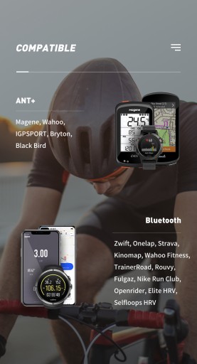 Kompatybilny z większością urządzeń Ant+ i Bluetooth takimi jak: GARMIN, POLAR, SUUNTO, iWATCH, WAHOO, TACX, BONTRAGER, TOMTOM, LEZYNE, ELITE, BRYTON, CYCPLUS, XOSS, MEILAN, THINKRIDER