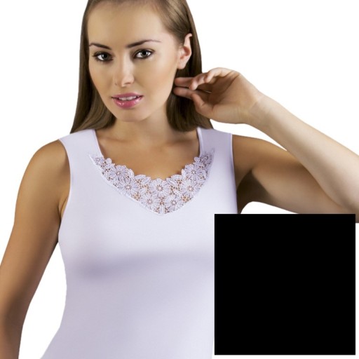 Klasyczna koszulka na szerokie ramiączko ozdobiona efektowną gipiurą.