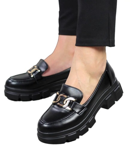 Modne czarne skórzane mokasyny na grubej podeszwie z łańcuchem Glam lekkie wygodne