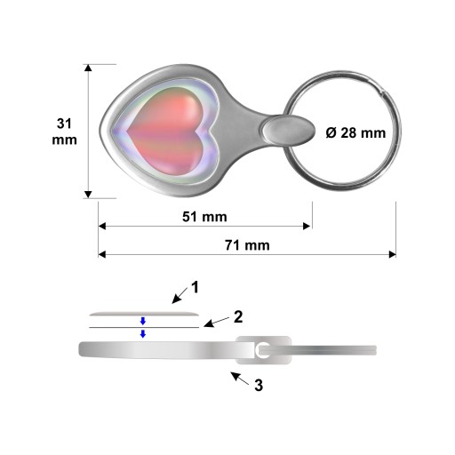 Grafika loga na przodzie breloczka wykonana z nadrukowanej srebrnej holograficznej folii metalizowanej, zalanej specjalnym polimerem.