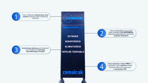 • Solidną konstrukcję ze stali, obłożoną płytą warstwową Dibond, co zapewnia wysoką wytrzymałość na obciążenia wiatrem i związaną z tym stabilność,