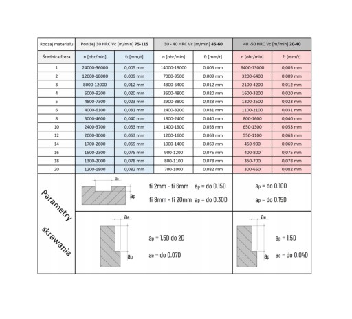 Frezy 55 HRC wykonane są z węglika ZK30UF, który charakteryzuje się wysoką twardością i odpornością na zużycie, a powłoka PVD TiSiN pokrywająca ostrze freza, poprawia jego wytrzymałość