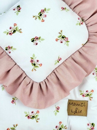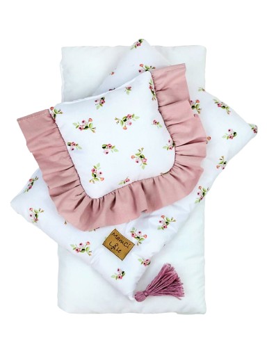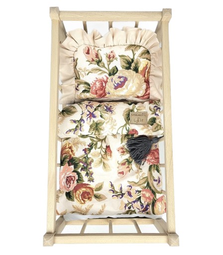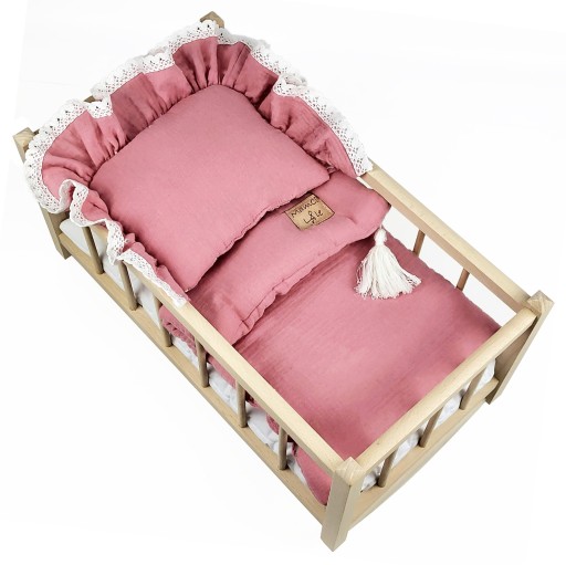 Wyłożone piękną, ręcznie wykonaną bawełnianą/muślinową pościelą. Kołderka dopieszczona jest chwostem, natomiast poduszka wykończona delikatną falbanką. Zestaw zawiera również materacyk. Doskonale sprawdzi się jako zabawka dla dziewczynek w wieku 2+.