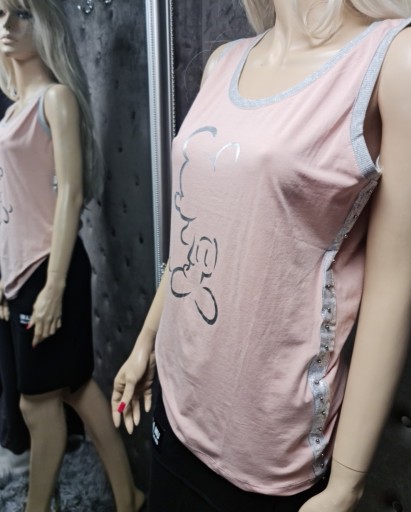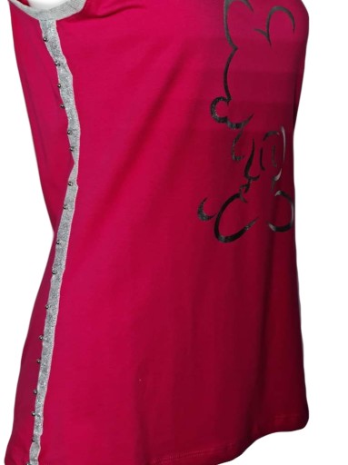 Top został ozdobiony nadrukiem fluo z wizerunkiem myszki Mickey oraz srebrnymi obszyciami.