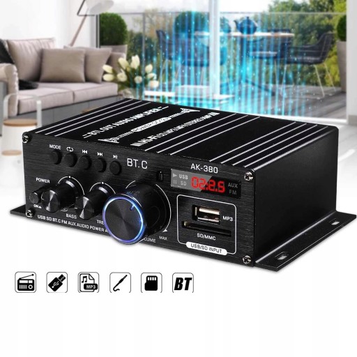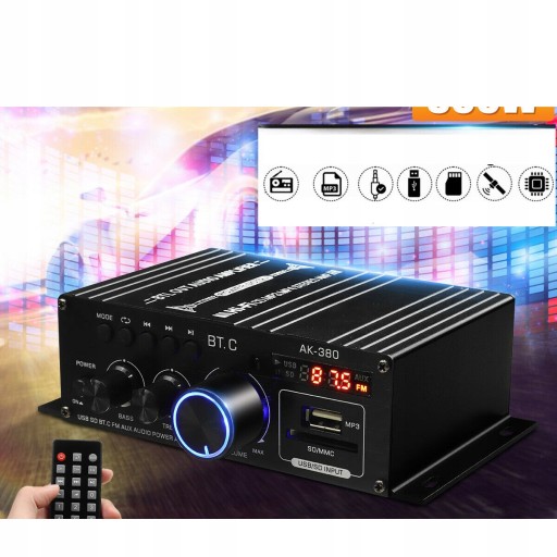 Wzmacniacz stereo Hifi 400 W 400 W ▶ Wzmacniacz mocy audio AK-380, prosty, kompaktowy, praktyczny i mocny, zapewniający moc szczytową 400 W 400 W i moc znamionową 40 W, zaawansowany projekt obwodów, wbudowany rdzeń Bluetooth 5.0 i układ YD7377, bez popu, po podłączeniu przez Bluetooth Brak słyszalnych dźwięków. Ied, przeznaczony dla klientów poszukujących efektów dźwiękowych HiFi.