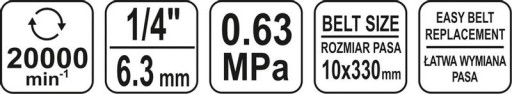 Szlifierka jest wyposażona w złączkę pozwalającą przyłączyć ją do układu pneumatycznego oraz trzy bezkońcowe taśmy ścierne o różnej ziarnistości.