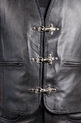 Materiał: skóra bydlęca o grubości 1,2-1,4 mm * Kolor: czarny * 4 kieszenie: 2 zewnętrzne i 2 wewnętrzne * Zapięcie: metalowe karabińczyki * Wiązana z boku rzemieniami