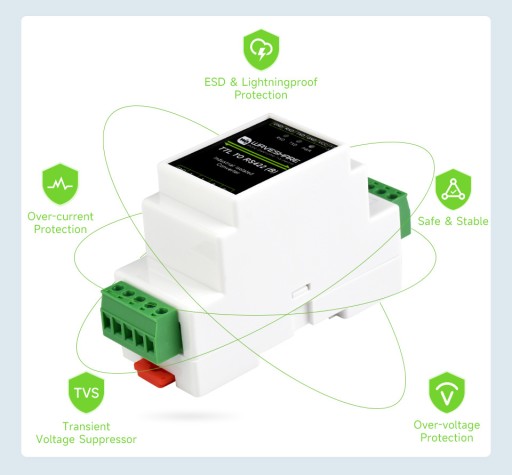 Onboard power and signal isolation, provide stable isolated voltage, high reliability and strong anti-interference. Onboard Lightningproof Diodes and TVS (Transient Voltage Suppressor), effectively suppress surge voltage and transient spike voltage in the circuit, lightningproof & anti-electrostatic. Onboard resettable fuse and protection diodes, ensures the current/voltage stable outputs, provides over-current/over-voltage protection, improves shock resistance