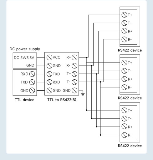 - Compatible with TTL/RS422 standard, converting the TTL signal into differential RS422 signal, support full duplex communication