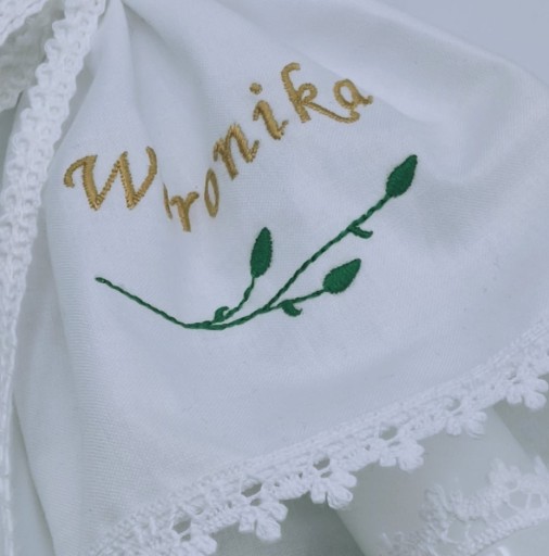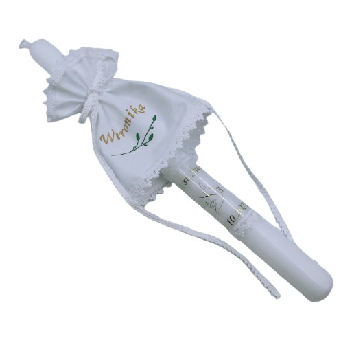 Ozdoba na świecę z haftowanym imieniem, wykończona bawełnianą koronką. Dodatkowo świeca przyozdobiona motywem z szatki z nadrukiem złotym, srebrnym - chrzest święty i data.