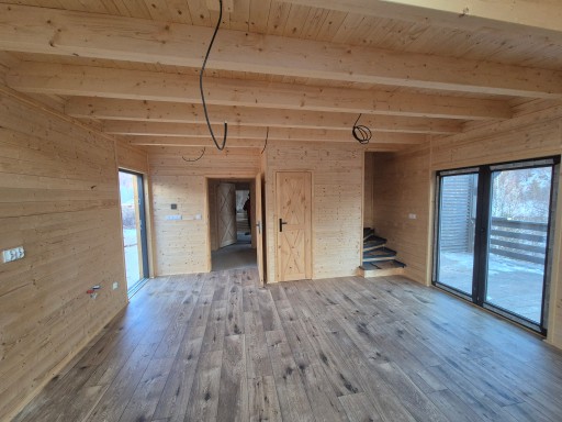 - Podłoga: Płyta OSB, folia paroizolacyjna, ocieplenie wełną 15 cm panele podłogowe AC4 (wybór koloru), legary suszone komorowo, bloczki fundamentowe.
