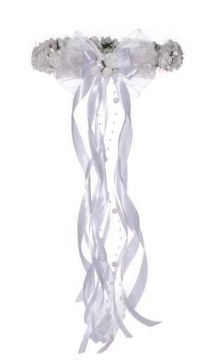 - Odpinana kokarda z koralikami i wstążkami, możliwość noszenia wianka z lub bez (bez kokardy wianek ma najmniejszy rozmiar)