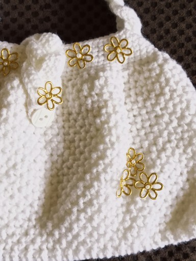 Torebka mięciutka, rozciąga się. Ozdobiona kwiatkami, zapinana na guzik.