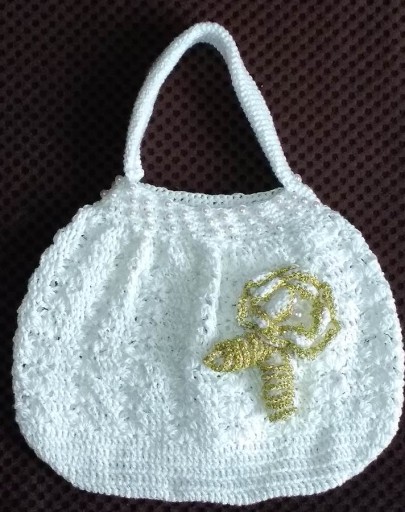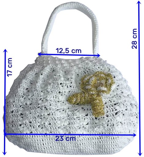 Torebka mięciutka, rozciąga się, ażurowa. Ozdobiona perełkami i kwiatkiem, zawiązywana na sznurek.