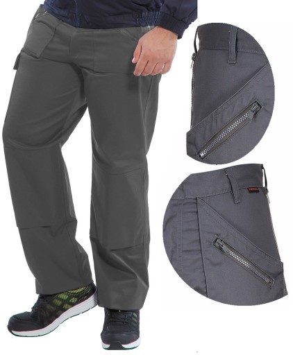 Spodnie robocze wykonane z trwałej mieszanki poliestrowo-bawełnianej ze wzmocnieniami. Posiadają liczne funkcjonalne kieszenie zapinane na zamki błyskawiczne oraz kieszenie na nakolanniki.