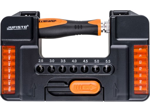 - wkrętak z możliwością regulacji długości, o ergonomicznym kształcie wykonany z tworzywa sztucznego poprawiającego chwyt