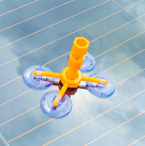 8️⃣Po całkowitym usunięciu powietrza z naprawianego ubytku, przekręć komorę podciśnieniową pół obrotu w lewo (w kierunku przeciwnym do ruchu wskazówek zegara). Zdejmij cały zestaw, łącznie z bazą, podważając przyssawki na jej nogach. Delikatnie wytrzyj nadmiar preparatu z szyby.