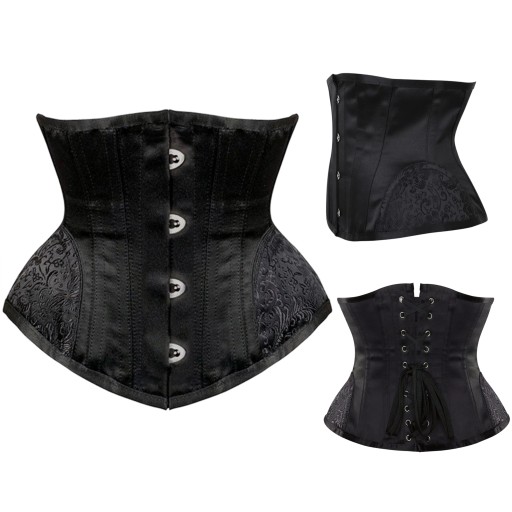 Wiązany gorset typu UNDERBUST wykonany z wytrzymałej, gęstej tkaniny o satynowym splocie. Konstrukcja wykonana z 14 metalowych fiszbin gorsetowych. Po bokach dekorowany delikatnym kwiecistym wzorem.