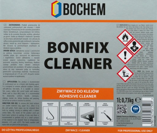 BONIFIX CLEANER to profesjonalny zmywacz o delikatnym jabłkowym zapachu. Perfekcyjnie usuwa pozostałości po klejach, olejów, smarów, tłuszczów czy zabrudzeń po gumie. Zaletą tego produktu jest uniwersalność, szybkie odparowywanie oraz łatwość w użyciu. Cleaner jest w pełni bezpieczny dla Twoich płyt meblowych! Nie pozostawia smug po wypolerowaniu!