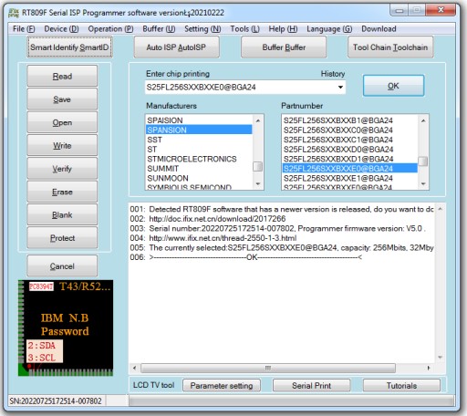 - Obsługuje serie układów SPI Flash 25 i 26. Ponadto potrafi automatycznie zidentyfikować ID układu i pojemność do 256Mbit.