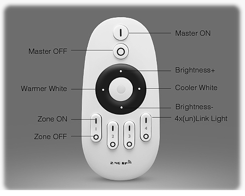 Funkcje sterowania w głównej mierze zależą od modelu urządzenia nadawczego. Umiejscowiona na środku pilota tarcza dotykowa odpowiada w głównej mierze za sterowanie oświetleniem. To właśnie dzięki można zmienić natężenie światła lub temperaturę barwową oświetlenia LED. Przyciski w górnej części urządzenia pełnią rolę włącznika/wyłącznika wszystkich dostępnych stref instalacji LED. Z kolei przyciski ułożone obok siebie w dolnej części pilota wyłączają lub włączają konkretną strefę. Energomiczna budowa pilota pozwala w prosty i wygodny sposób sterować oświetleniem. Wszystko to możliwe jest dzięki intuicyjnemu rozmieszczeniu przycisków.