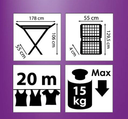 ● Wymiary suszarki rozłożonej: 178 x 106 x 55 cm