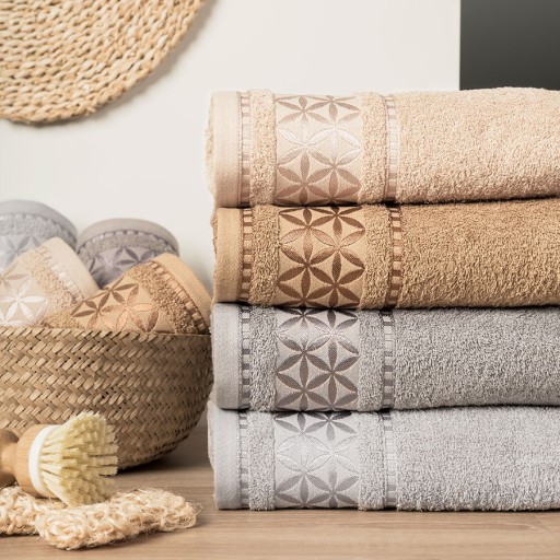 Ręczniki PAOLA opatrzone są delikatnym, połyskliwym wzorem, który ciekawie akcentuje się na grubej, puszystej tkaninie. Modna, subtelna bordiura dodaje ręcznikowi wyjątkowej estetyki, o czym przekonasz się, wieszając go na haczyku. Równie atrakcyjnie będzie prezentował się ułożony w równą kostkę na półce łazienkowej. Alternatywnym sposobem na przechowywanie ręczników jest wiklinowy koszyk. Połączenie dwóch naturalnych materiałów – wikliny i bawełny wniesie do łazienki dużo ciepłą i harmonii.