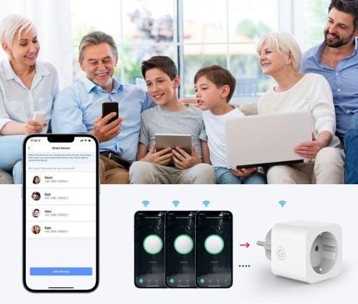 Gniazdkiem można sterować z wielu telefonów, które mają pobraną aplikacje. Każda osoba z rodziny może mieć dostęp z każdego miejsca na ziemi.