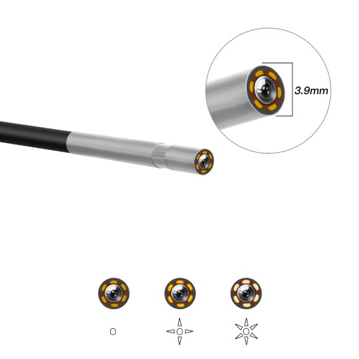 Kamera posiada wbudowane 6diod LED, które doświetlają miejsce pracy endoskopu. Diody posiadają regulację jasności dzięki czemu możemy uniknąć prześwietlenia obrazu i dostosować moc diod LED do sytuacji.