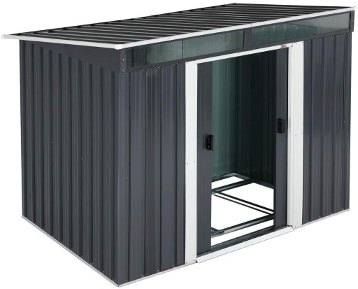 Szopa ogrodowa ma również drzwi przesuwne, otwory wentylacyjne na górze i jest wyposażona w listwę przypodłogową.