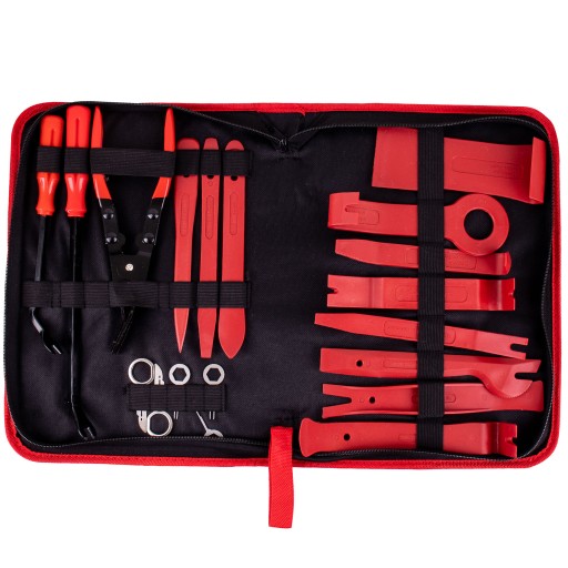Wielofunkcyjny profesjonalny zestaw 19 narzędzi do demontażu radia i tapicerki samochodowej.