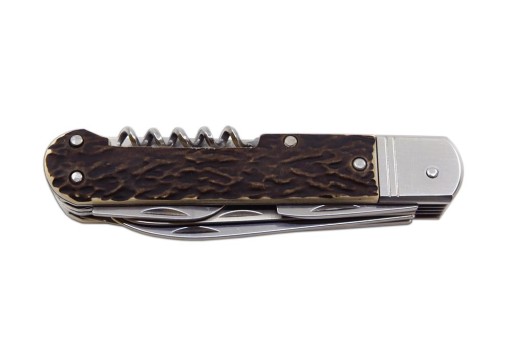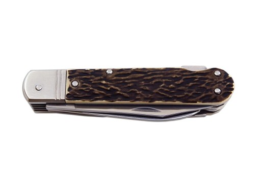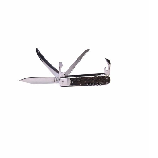 Scyzoryk ma stalowy szkielet, do którego zamocowano polimerowe okładziny, które doskonale imitują poroże jelenia. Chropowata faktura tworzywa zapewnia pewny i wygodny chwyt oraz podkreśla myśliwski charakter scyzoryka. Nóż wyposażono w zestaw specjalistycznych narzędzi, przydatnych podczas polowania, biwaku i wypadku do lasu. m.in. dwurządową piłę do drewna i kości, specjalne ostrze do skórowania (down blade) oraz duże ostrze blokowane po rozłożeniu.