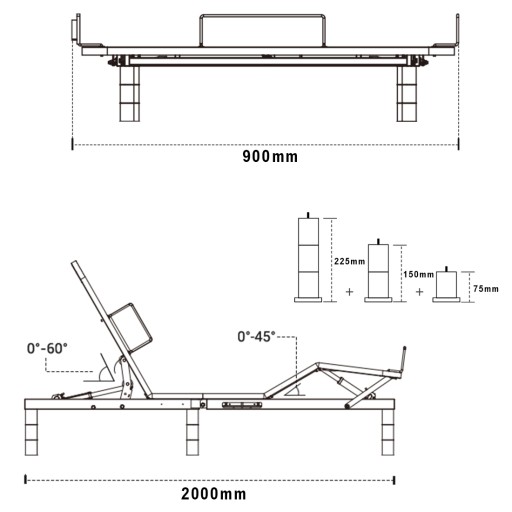 Regulowane łóżko Spacetronik może być używane jako samodzielny system nośny lub zostać zainstalowane do standardowej ramy łóżka bez stelaża z listew. Nowoczesne łóżko elektryczne Dozee zostało wyposażone w 6 modułowych nóg, które pozwalają uzyskać trzy różne wysokości łóżka - 7,5cm, 15cm lub 22,5cm (od podłogi do spodu stelaża). Przestrzeń pod łóżkiem, zwłaszcza w najwyższym możliwym ustawieniu może służyć jako schowek.