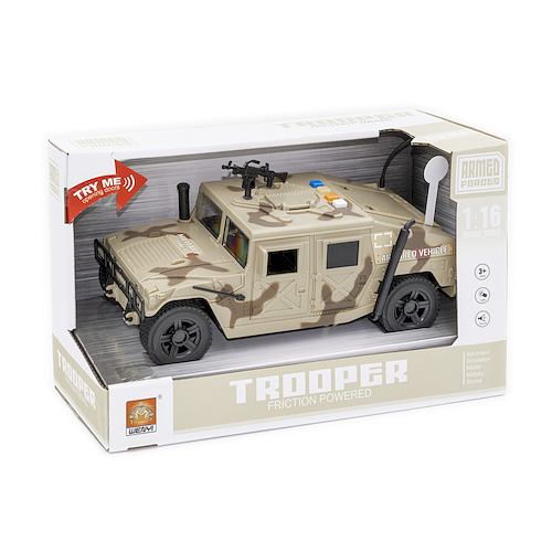 WY610B AUTO WOJSKOWE ŚW/DŹW Auto wojskowe z otwieranym włazem, bagażnikiem i drzwiami. Otwarte kolorowe pudełko przekazuje wszystkie najważniejsze informacje dotyczące zabawki. Chłopcy uwielbiają bawić się samochodami. Najlepsze są takie, które odzwierciedlają w detalach prawdziwe pojazdy. Zabawka wykonana z dobrej jakości plastiku w skali 1:16. Zabawka łatwo wyczyścisz wilgotną ściereczką.