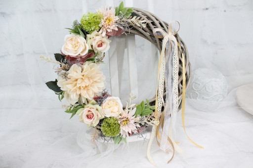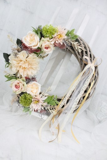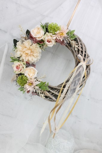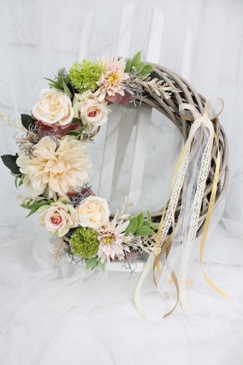 Piękny wianek wiklinowy o średnicy 30cm udekorowany kwiatami róż, pełnika i astrów. W odcieniach jasnego pudrowego różu i beżu.