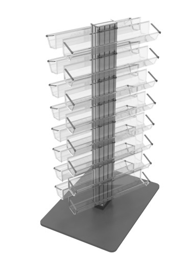 Obrotowy stojak na lakiery do paznokci, wykonany z anodowanego aluminium i plexi.