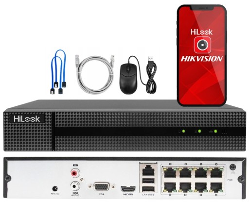 - 1x rejestrator 8-kanałowy NVR-8CH-5MP/8P Hilook By Hikvision z wbudowanym zasilaczem PoE, zdalną pracą w chmurze oraz możliwością nagrywania obrazu do 4K @8Mpx