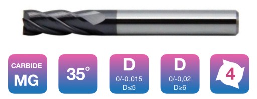 - Kąt pochylenia lini śrubowej rowków wiórowych: 35°
