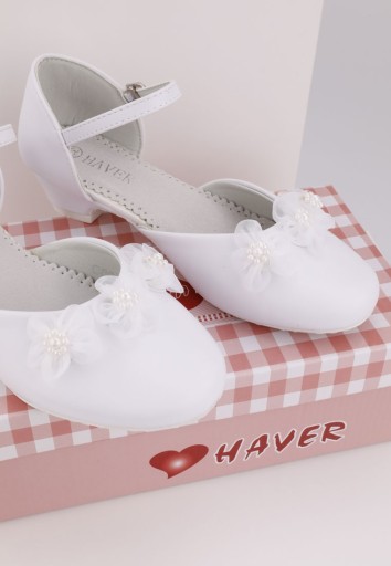 Balerinki dziewczęce, na małym obcasiku. Cholewka wykonana z najwyżeszej jakości skóry ekologicznej. Z przodu ozdobne kwiatkuszami z satynowego materiału. Cienki pasek wokół kostki sprawia że buty doskonale leżą na nodze . Buciki są utrzymane w eleganckim stylu, dzięki czemu pasują do prostej sukienki lub alby komunijnej.