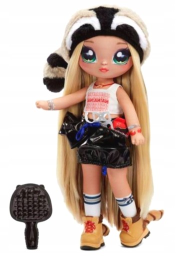 Getchen Stripes pochodzi z serii miękkich kolorowych lalek Na! Na! Na! Surprise Teen o wysokości 28 cm. Ubrana jest w crop top, czarne spodenki oraz brązowe buty. Ma puchatą czapkę z ogonkiem szopa w paski, a także piękne bransoletki. Jej duże zielone oczy zauroczą nie jedną fankę pięknych lalek!